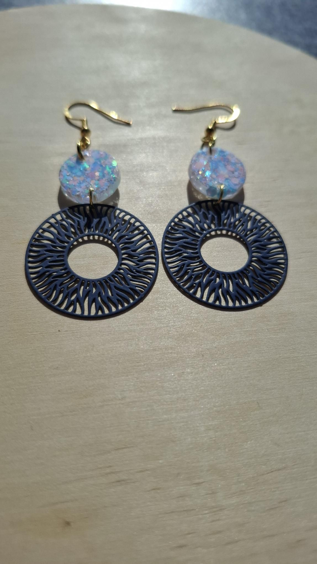 Boucles d'oreilles en acier inoxydable création artisanale, resine pailletée bleue et rose.