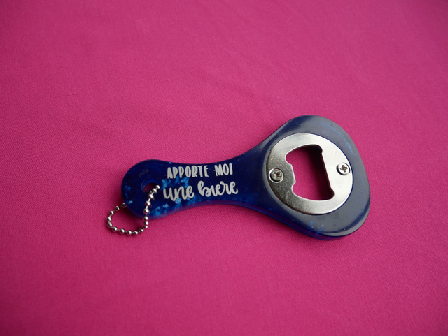 decapsuleur en resine bleu avec une petite touche d'humour "apporte moi une bière"
