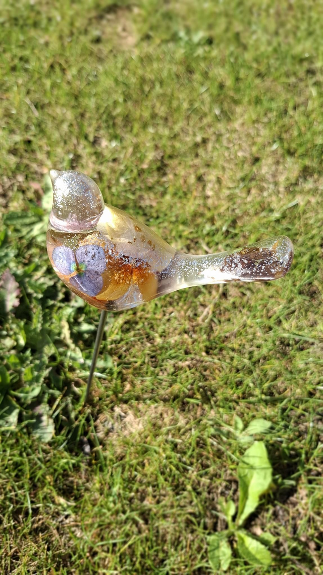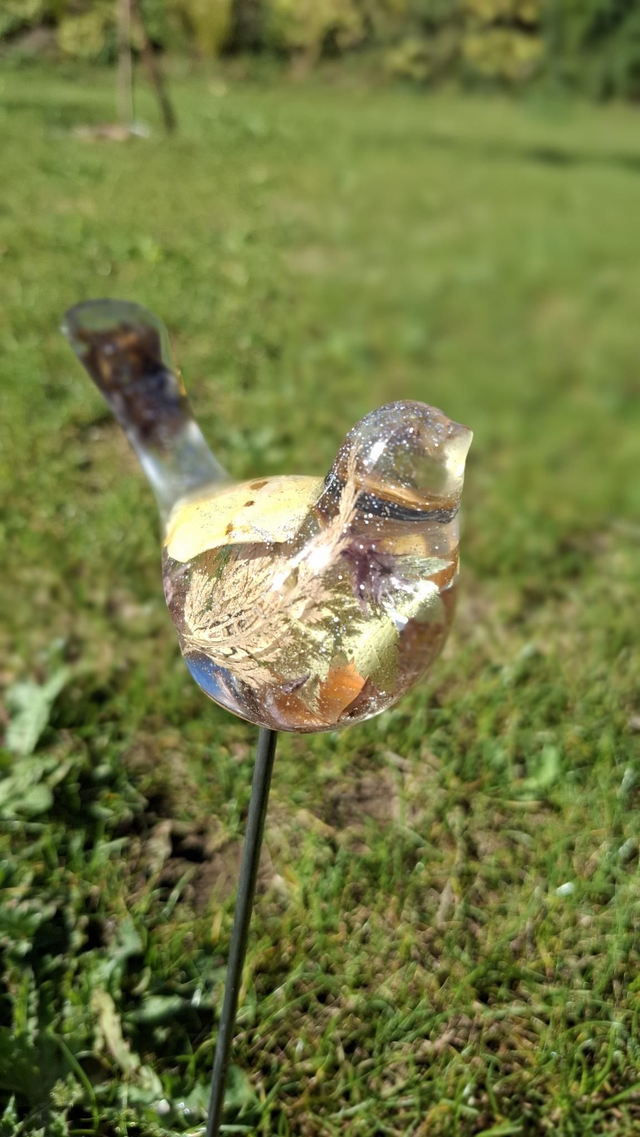 Oiseau en resine pailletée dorée en véritables fleurs séchées de mon jardin. Il est monté sur une tige en métal d une trentaine de cm. Résiste au temps( le fer rouillera naturellement au fil des années), apporte une touche originalité à votre jardin ou votre plante d intérieure. Pièce unique !!!!