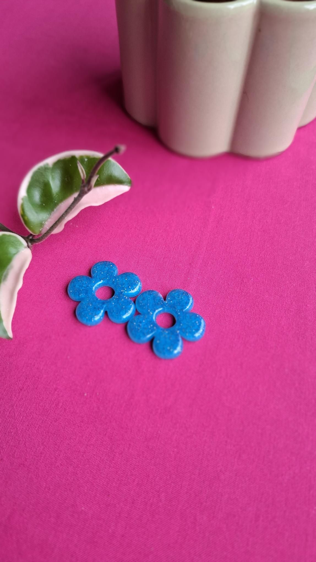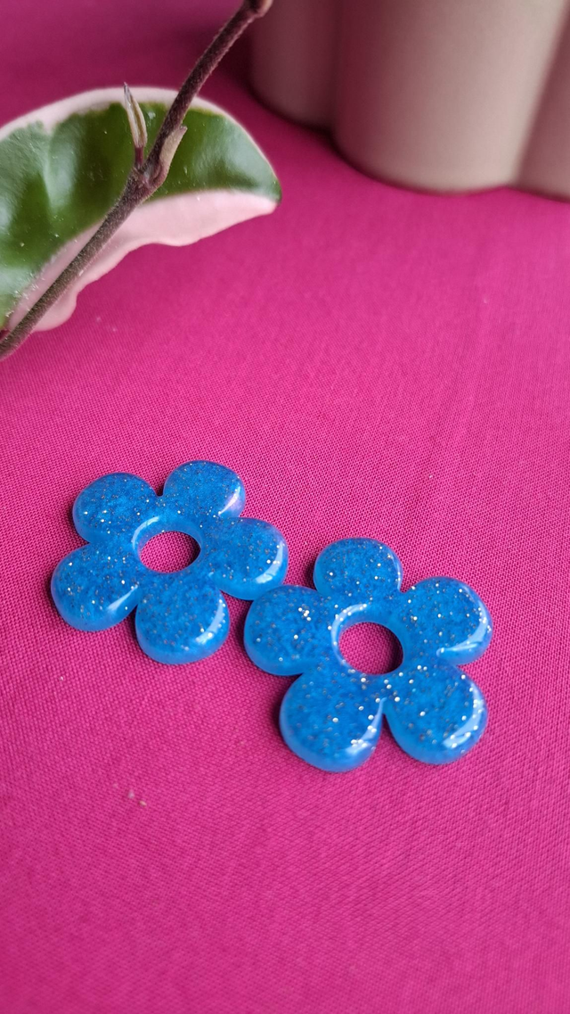 Recharge pour boucles d'oreilles interchangeable ! Ne rachète plus des boucles d oreilles entières, tu as déjà une paire de créoles il suffit d y glisser ta Recharge et te voilà avec une nouvelle paire ! Fleurs de 2 ,5cm environ de diamètre total en resine bleue légèrement pailletée