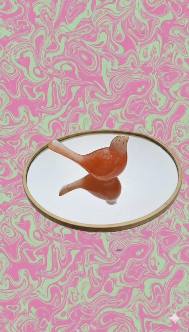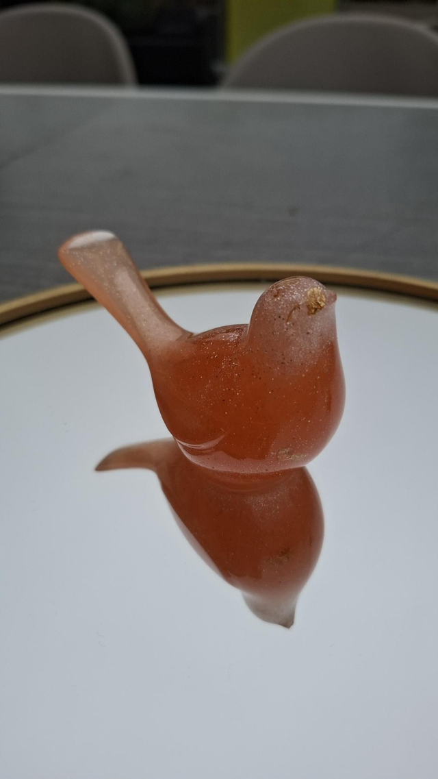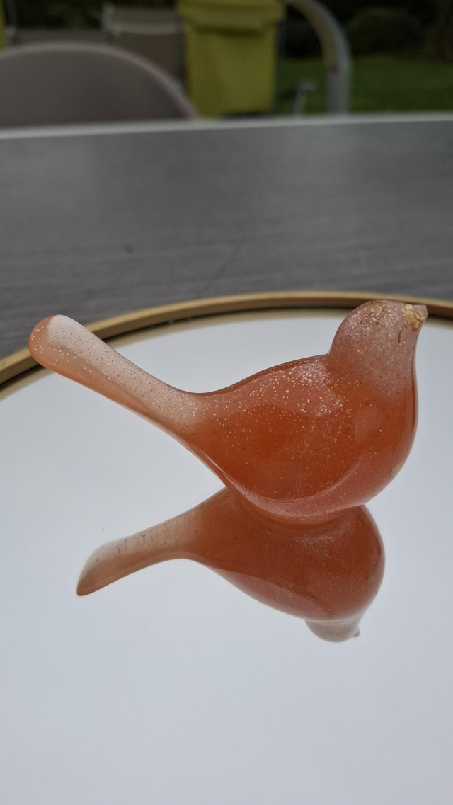 Oiseau en resine orange pailletee. Decoration lumineuse et resistante